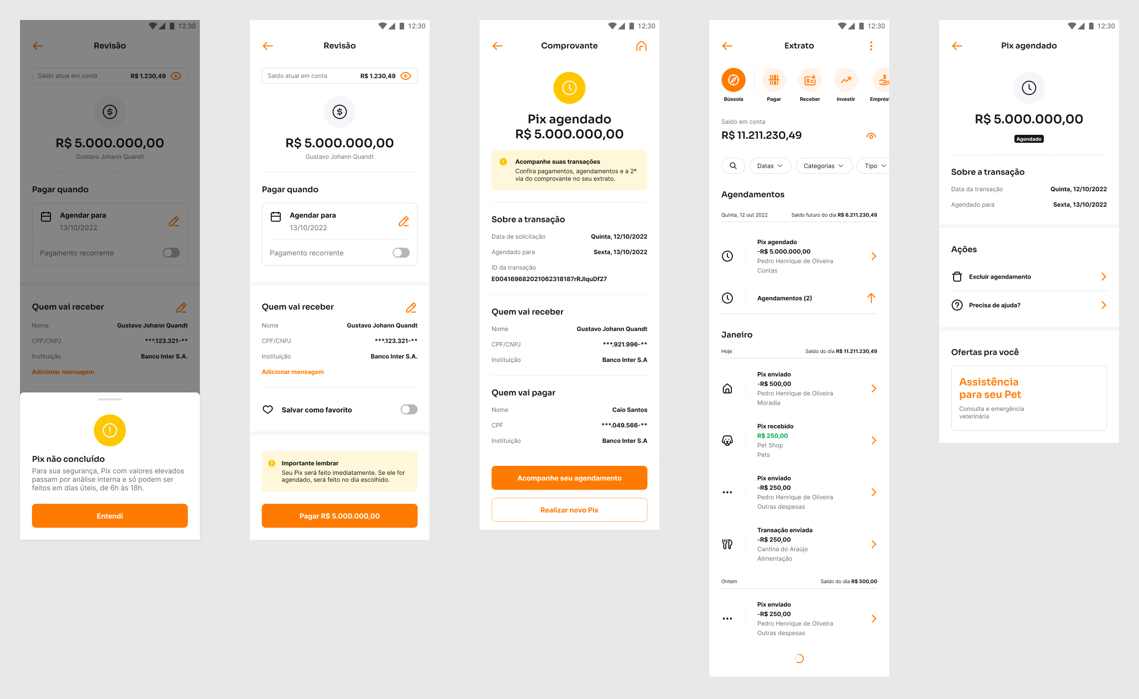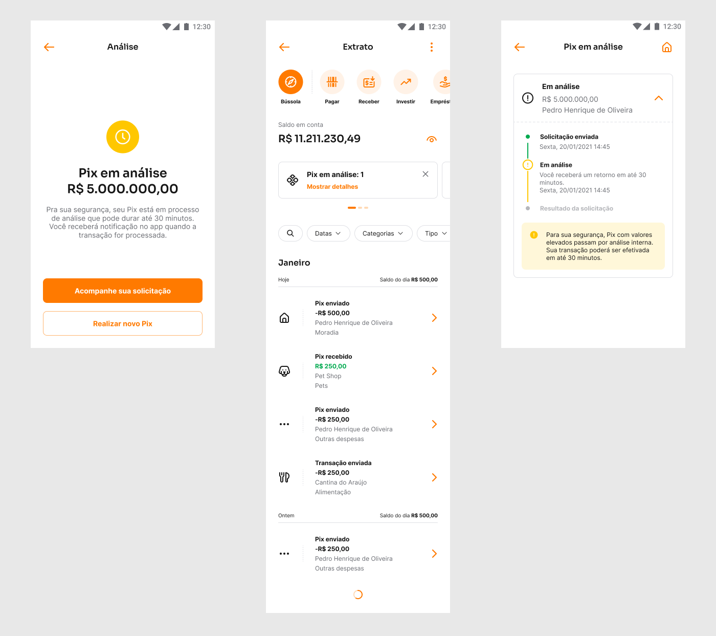 This project was designed entirely by me. The product needed some form of validation if a payment of R$ 5.000.000,00 or more was scheduled. We needed to warn the user that this validation would happen, and that should be done very smoothly because it involves a large sum of money.